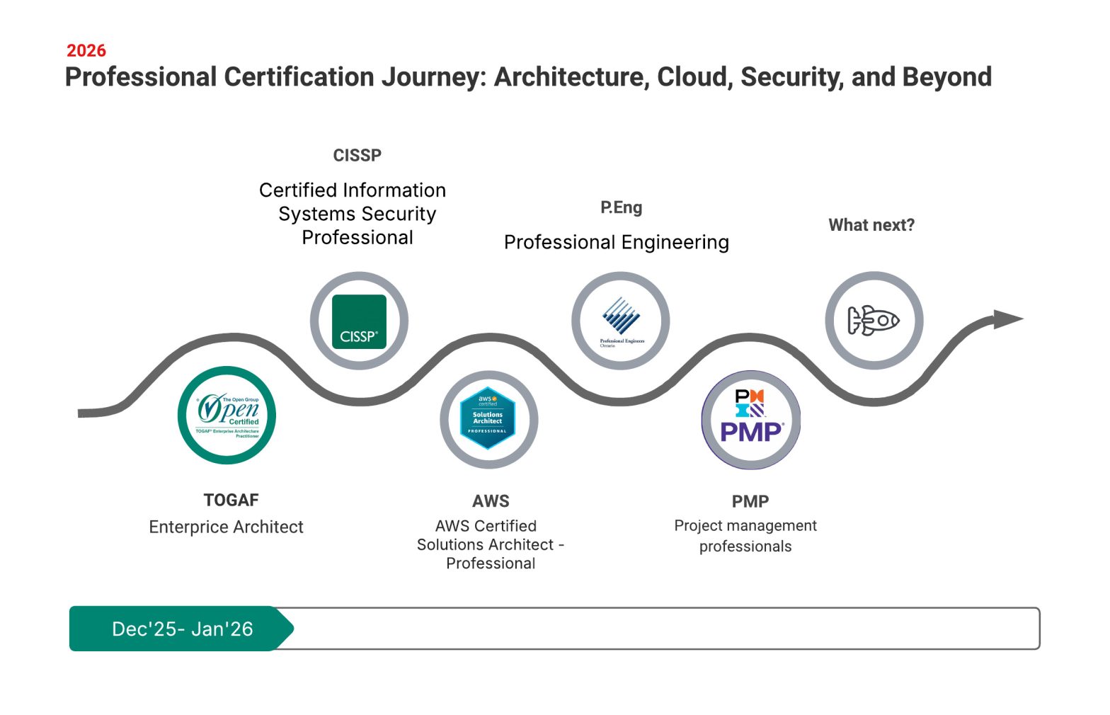 As we move into 2026, I wanted to pause and document an important milestone in my professional journey โ one that reflects years of deliberate learning across enterprise architecture, cloud computing, security, project management, and engineering practice. This journey is not about collecting badges, but about building depth, integration, and leadership capability across complex technology… Continue reading My 2026 Professional Certification Journey: Architecture, Cloud, Security, and Beyond